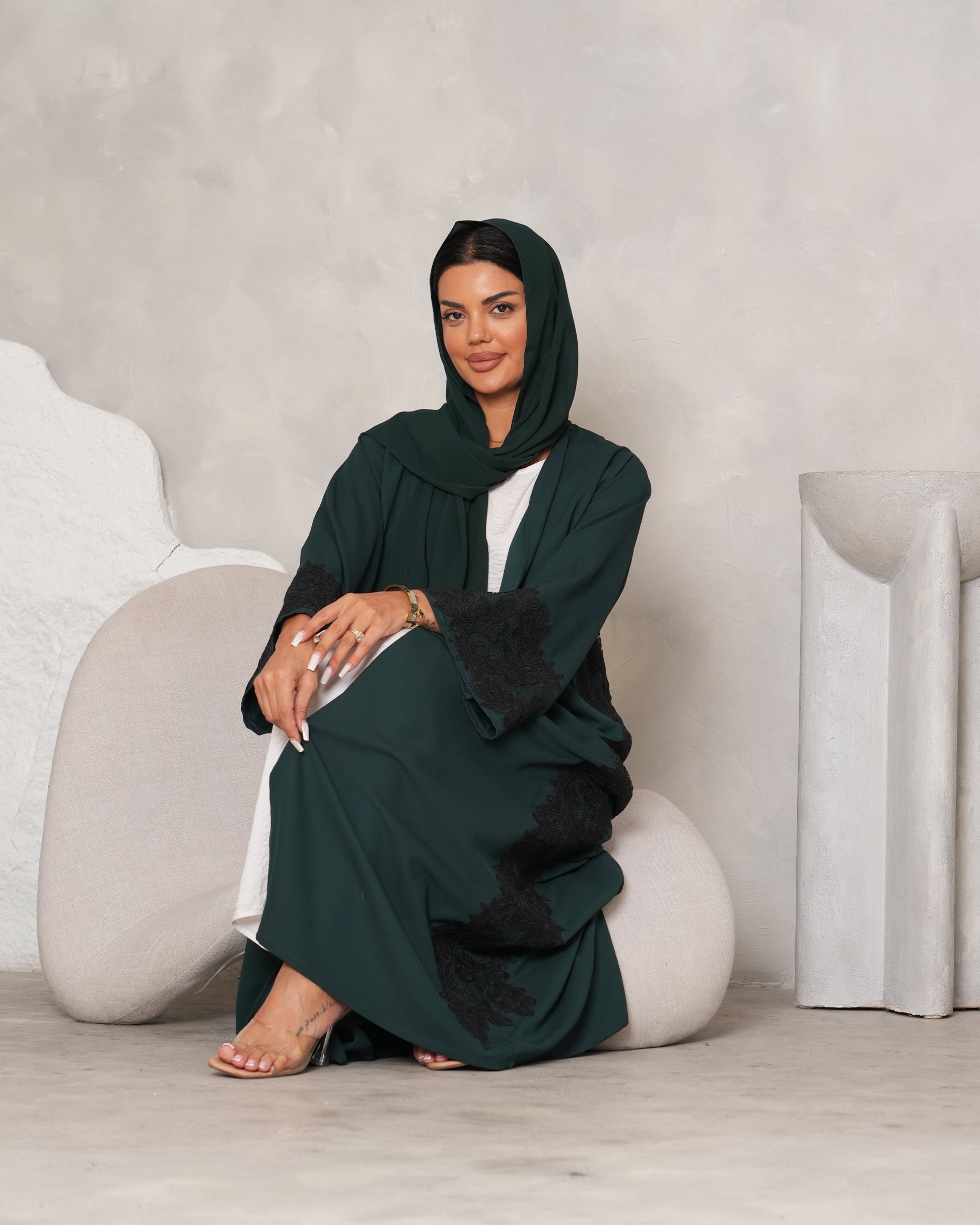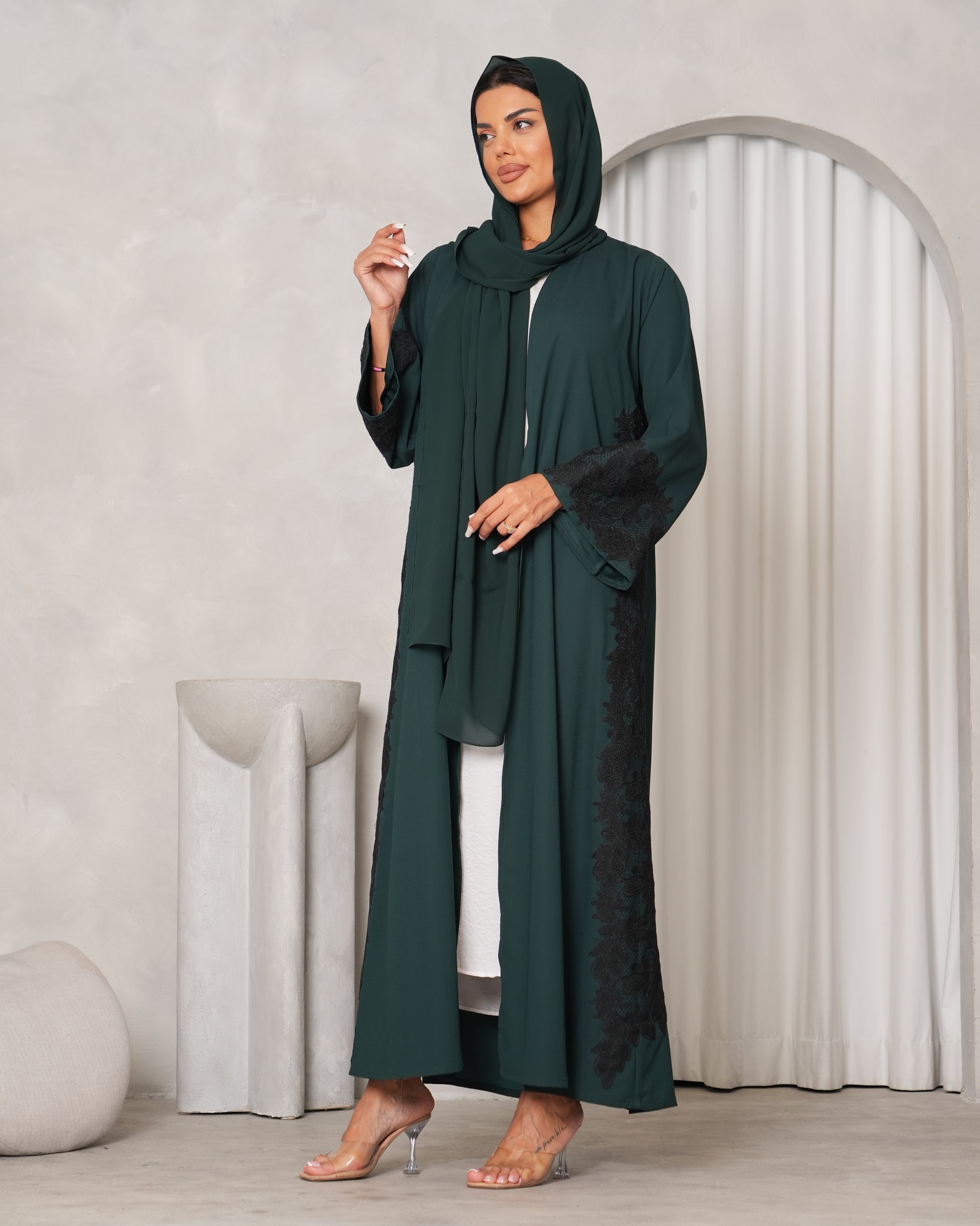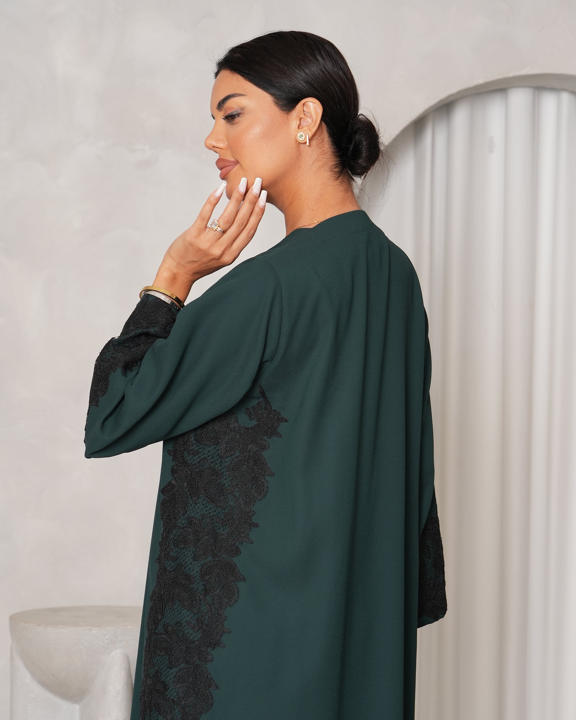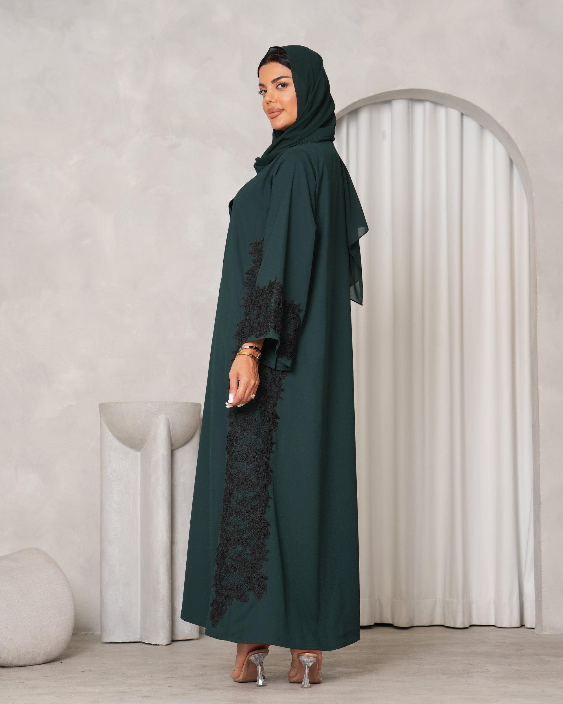 Emerald Green Abaya with Black Dantel, timeless elegance in top Korean Crepe fabric and best quality Dantel.